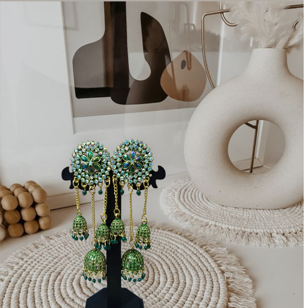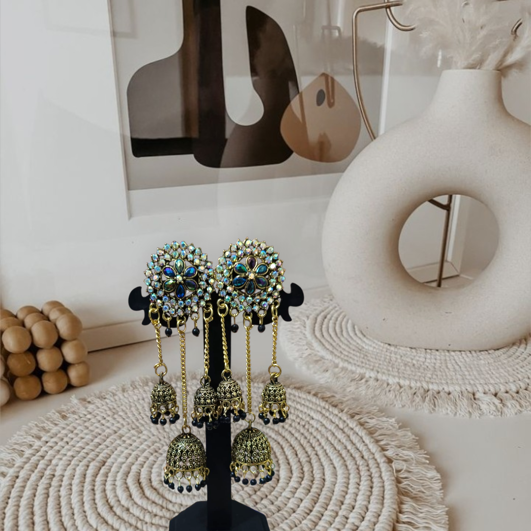 Elevate your ethnic ensemble with our traditional Indian multi-tiered oxidized Jhumkas. Crafted with precision and adorned with a gold-toned finish, these earrings boast a classic vintage appeal that exudes sophistication. Perfect for cultural festivities, weddings, or everyday traditional wear, they are designed to turn heads and capture hearts.