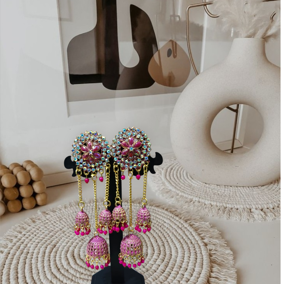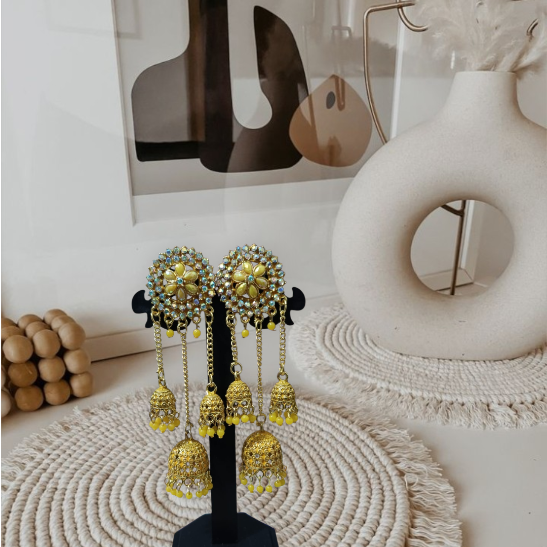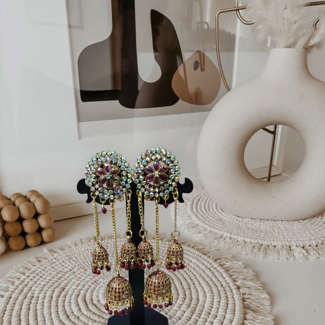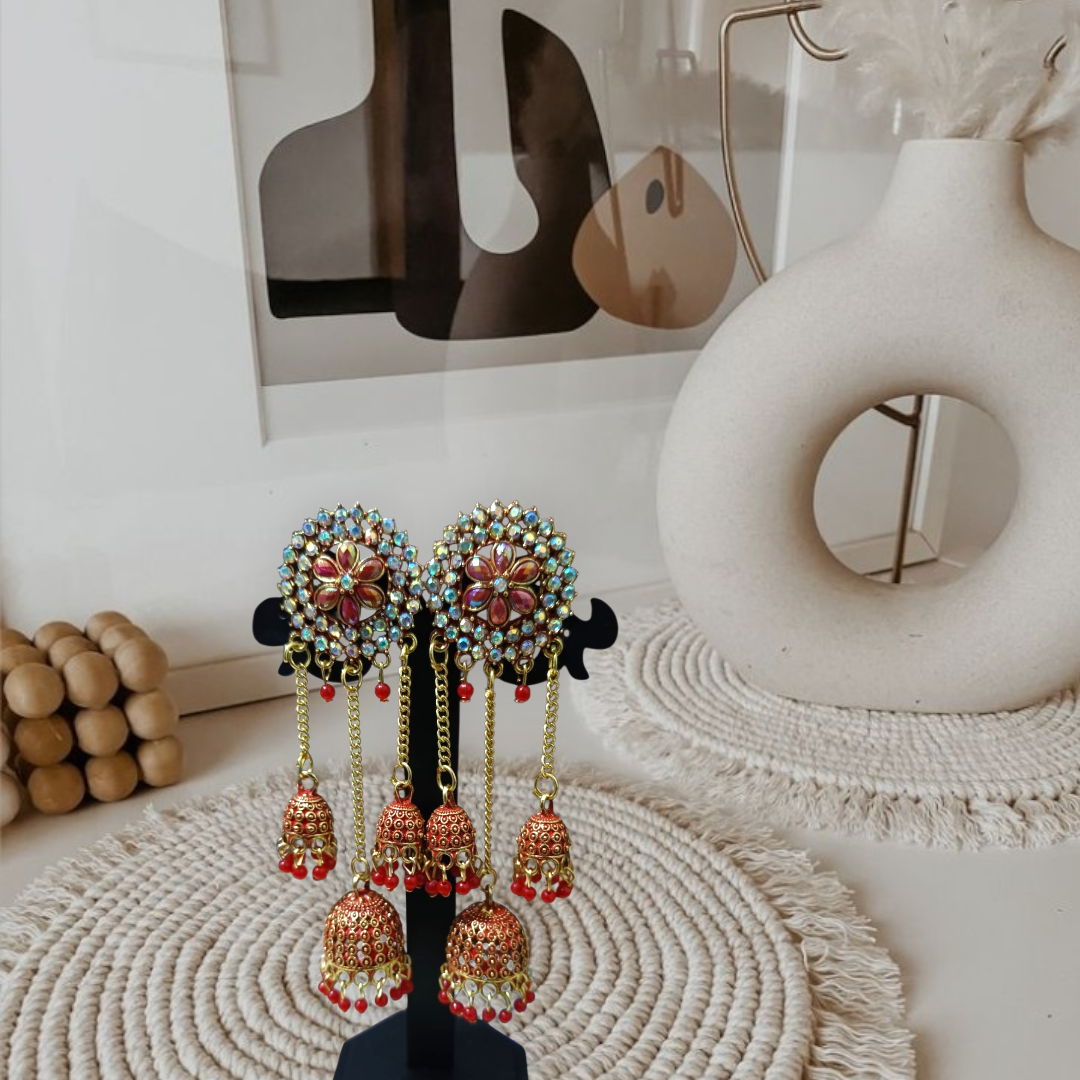These Jhumkas feature a stunning circular floral stud embedded with colorful stones, offering a pop of charm and elegance. The stud connects to smaller bell-shaped jhumkas through delicate dangling chains, showcasing intricate filigree (tarakashi) work that symbolizes the finesse of Indian craftsmanship. The red bead accents further enhance the ornamental beauty, adding a subtle hint of vibrancy to the design.